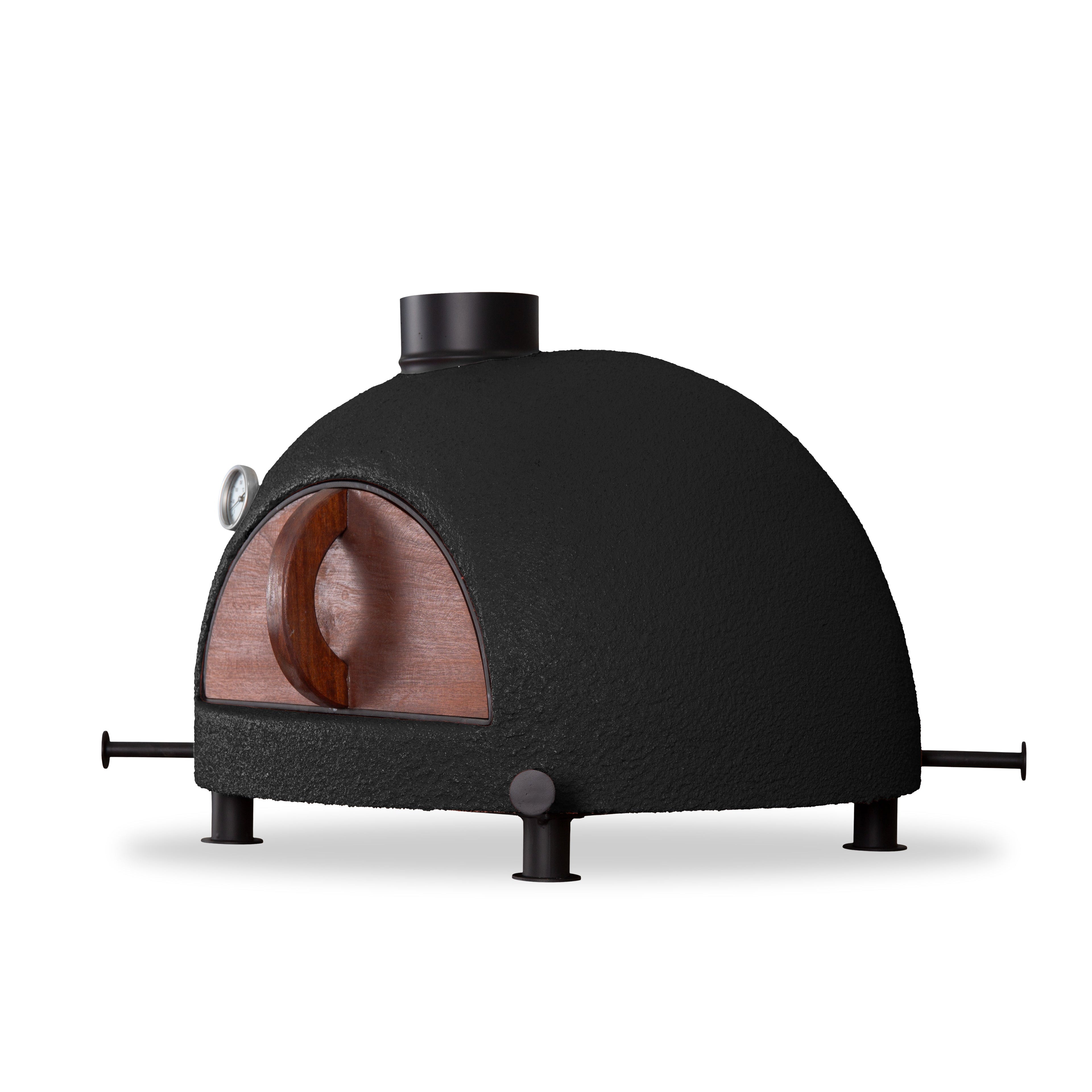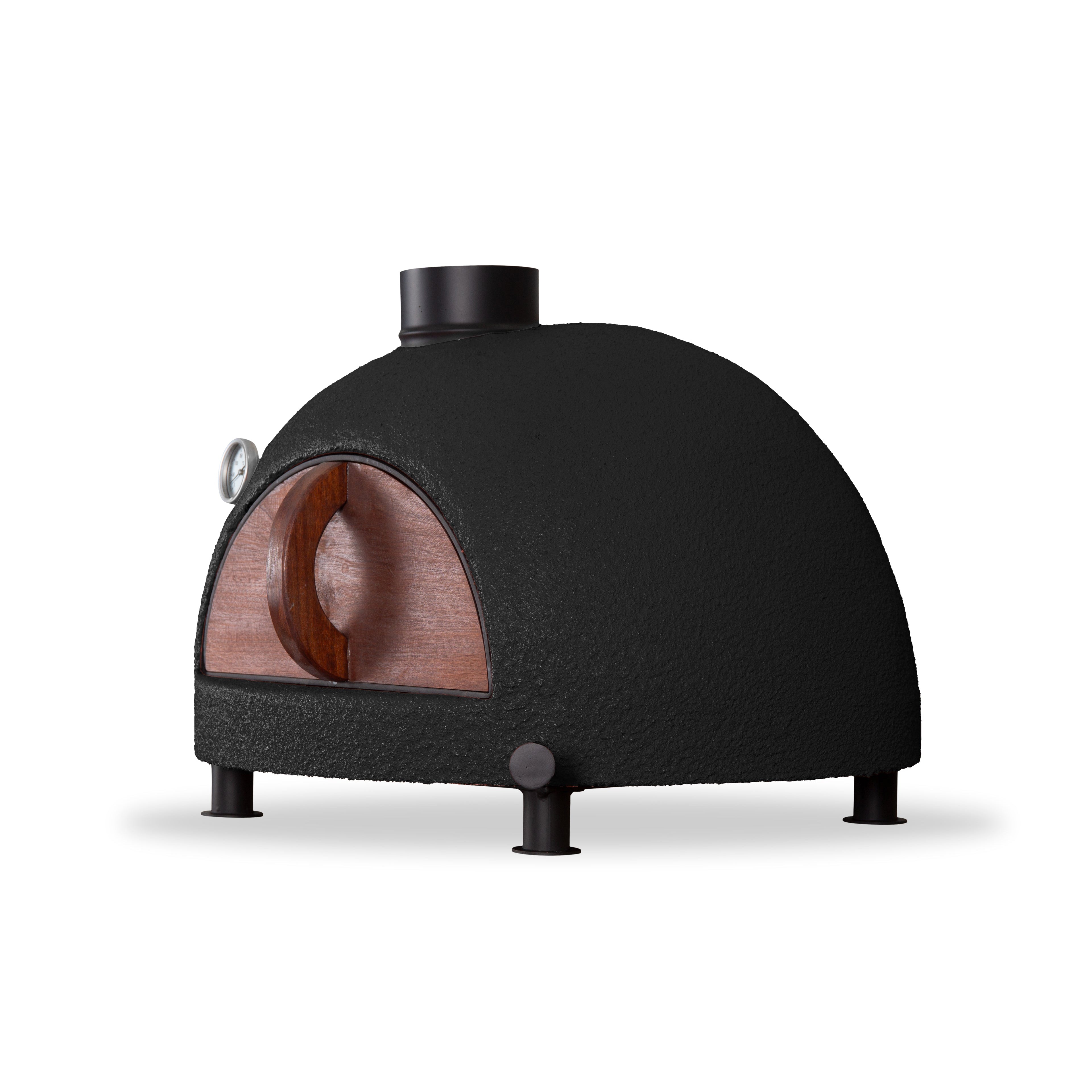 A traditional bench top wood fired oven crafted from premium refractory clay. Hand made in Portugal using natural materials and beautifully finished in black colour option. Designed with a mahogany insulated door and black painted stainless-steel feet, base, base plate and flue, ensuring durability, rust resistance, and performance perfectly suited to Australian conditions.